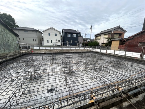 現在はまだ鉄筋の骨組みの状態ですが、この大切な基礎工事を一つひとつ丁寧に確認しながら進めています。