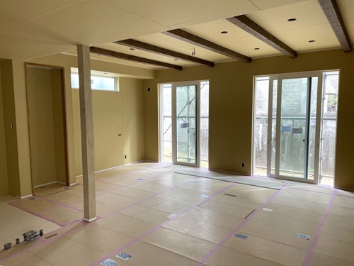 このタイミングで一度、お施主様にも現場をご確認いただき、これから進んでいく内装仕上げについてご説明をさせていただいたうえで、次の工程へと進めてまいります。