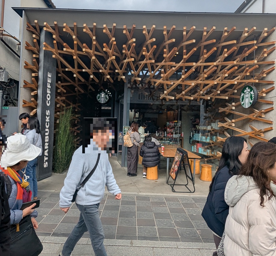 門前町を散策していると有名なコーヒーショップが、木をたくさん使用した斬新なデザインの門構えは、景観に馴染むようなデザインでした。